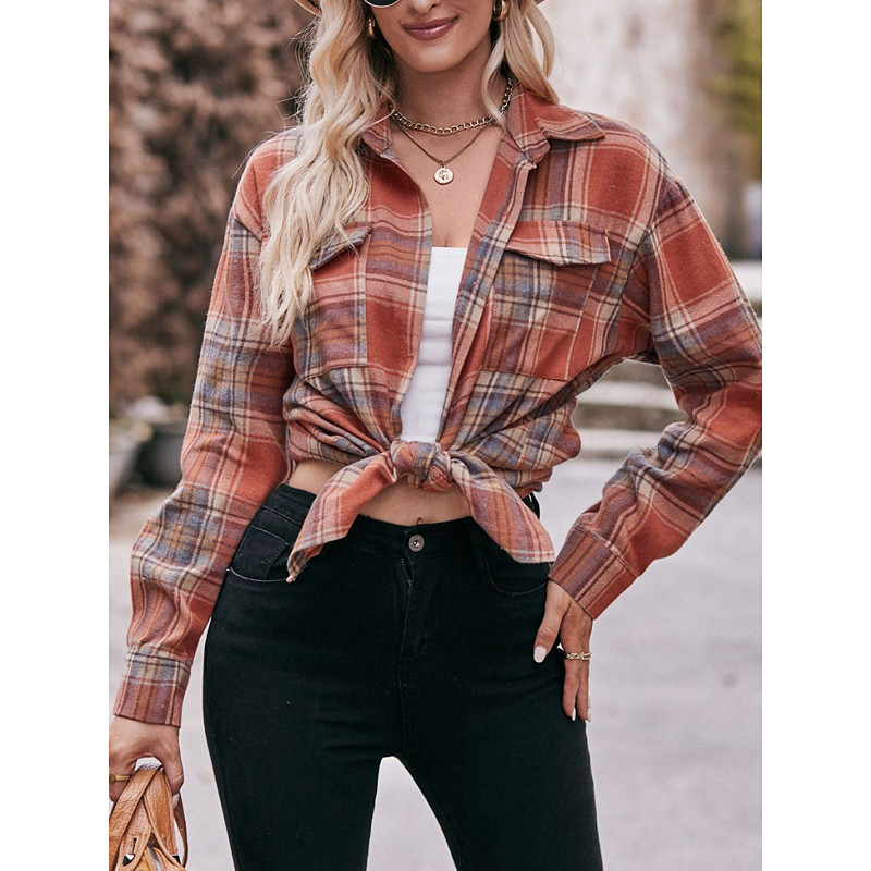 Women's Shirt Plaid Vintage Tropical Stylish Long Sleeve Shirt Collar Crop Tops Daily Pocket Buttons Print Yellow Red Light Brown Blue Brown Spring Fall
