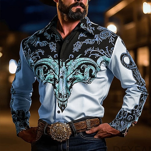 Per uomo Mucca Stampa Floreale Fiori Camicia Camicia Western Camicia da cowboy Manica Lunga Vintage Retrò All'aperto Vacanza Primavera Autunno Collo ripiegato Stampa 3D Camicia tipo lino Blu Verde