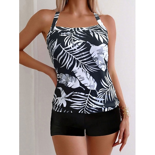 Costume da bagno tankini da donna 2 pezzi pantaloni corti palma controllo pancia vita alta slinguato senza schiena vacanza in spiaggia scollatura a giro floreale senza maniche