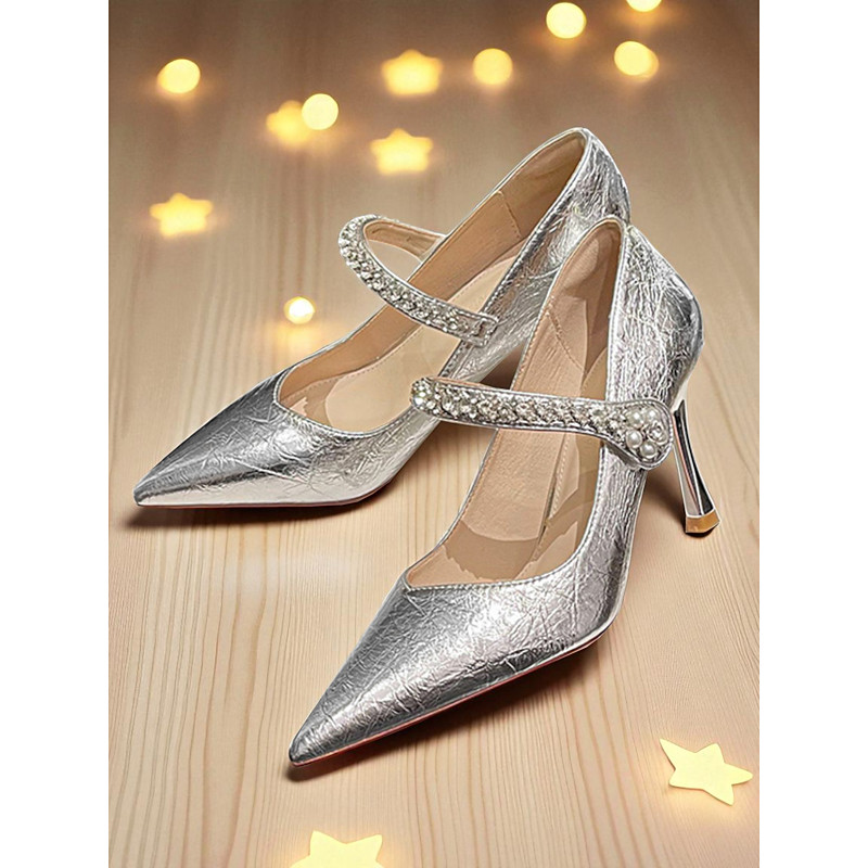 Women's Gold Metallic High Heel Pumps - Pointed Toe Dress Shoes with Pearl Rhinestone Strap for Formal Occasions Christmas Parties