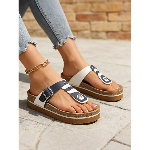 sandali infradito con plateau in sughero da donna - infradito basse con cinturino a T chic e fibbia, calzature estive casual color-block da spiaggia per le vacanze, le passeggiate e il comfort quotidiano.
