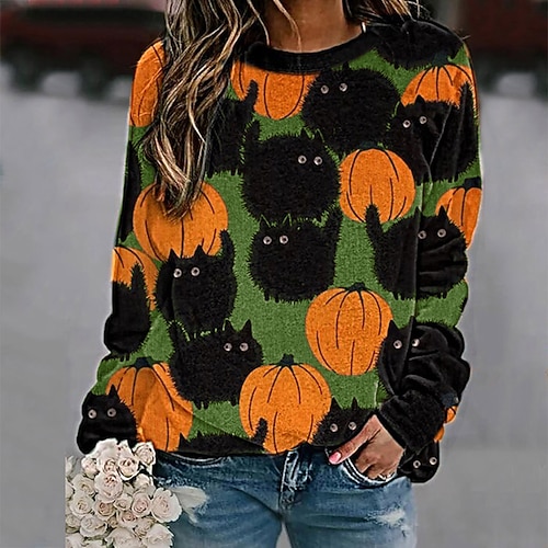 Per donna Felpa Pullover Felpe Gatto Zucca Streetwear Casual Manica Lunga Girocollo Top Regolari Streetwear Ferie Uscire Stampato Nero Giallo Verde scuro Arancione Verde Autunno Inverno