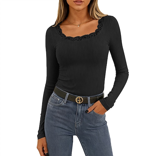 Per donna Maglietta Top con cuciture in pizzo Top estivi Grafico Semplice Elegante Moda Classico Manica Lunga Collo quadrato Top Regolari Quotidiano Uscire Weekend Pizzo Patchwork Blu Nero Rosa Rosso