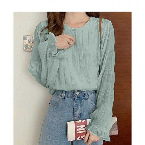 Per donna Blusa Tinta unica Casual Manica Lunga Girocollo Top Regolari Quotidiano Uscire Weekend Volant Patchwork Nero Bianco Verde chiaro Marrone Verde Primavera Autunno