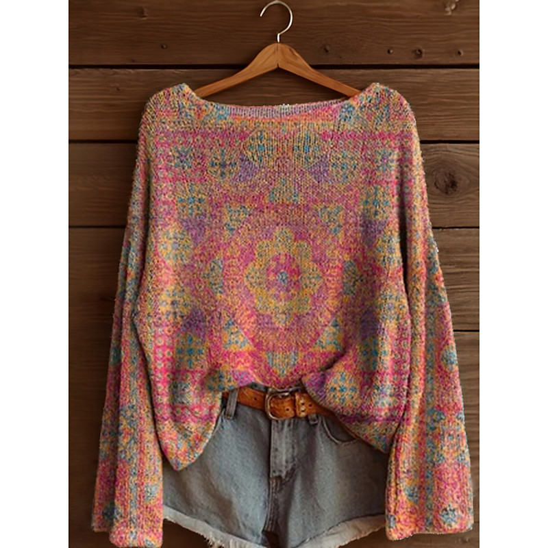 Women's Sweater Casual Soft Floral Graphic Ribbed Boat Neck Floral Knitted Print Long Sleeve Regular Tops Knit Outdoor Daily Weekend Yellow Pink Spring Fall