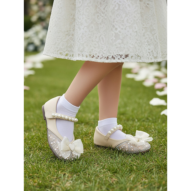 Kid's Pearl Strap Bow Flower Girl Shoes with Rhinestone Toe, Elegant Faux Leather Princess Dress Flats for Little Girls, Comfortable Low Heel Wedding Shoes Perfect for Flower Girls