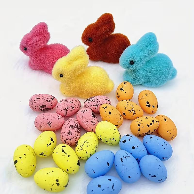 28 sets Easter Eggs and Bunny, Foam Speckled Easter Eggs with Plush Bunnies for Easter Party Decorations, Table Centerpieces, Spring Holiday Home Decor