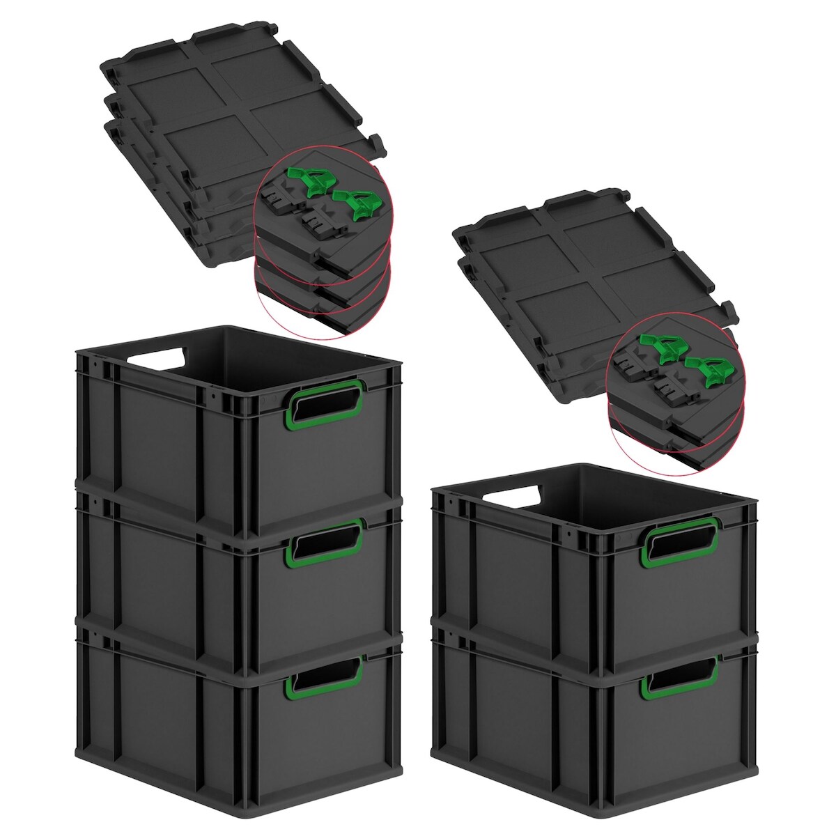 PROREGAL SuperSparSet 5x Eurobox NextGen Color mit Scharnierdeckel & Verschlüssen, HxBxT 22x30x40cm, 20L, Schwarz, Griffe grün offen, Eurobehälter