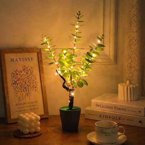 Luce notturna a LED realistica con pianta in vaso, alimentata tramite USB, con foglie di palma, monstera ed eucalipto – illuminazione decorativa per interni per camera da letto, soggiorno, studio,