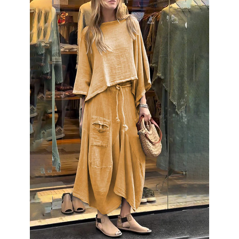 Women's Elegant Fashion Basic Pants Sets Long Sleeve Round Neck Solid Color Outdoor Work Casual Black White Yellow Summer Regular Fit