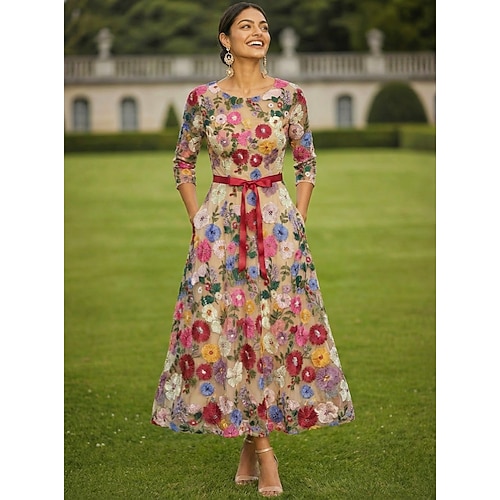 Linea ad A Abito Lunghezza alla caviglia Vestito da Festa Abito da Cocktail Abito da cerimonia per signora Manica 3/4 Girocollo Elegante Vintage Formale Ospite di nozze Ferie Chiffon Tulle con Ricamo