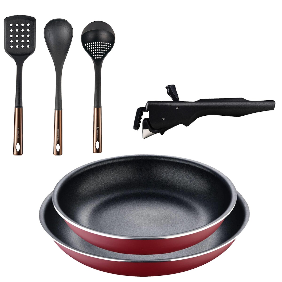 BERGNER - Set aus 2 Pfannen Ø22/26 cm gepresstes Aluminium Rot mit abnehmbarem Griff mit Set aus 3 Küchenutensilien PBT Schwarz und Kupfer