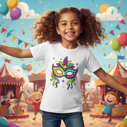 100% Baumwolle Mardi Gras 2026 Karneval Kinder Mädchen Blau Schwarz Weiß Grafik Maske T-Shirt Rundhalsausschnitt Kurzarm Urlaub Sport Outdoor Alltagskleidung Aktiv Neutral Lässig Drucken Sommer