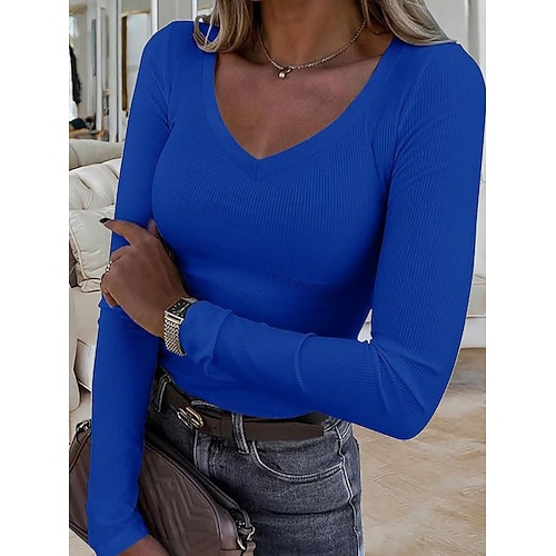 Per donna Maglietta Tinta unica Elegante Essenziale Casual Manica Lunga Scollo a V Top Regolari Quotidiano Nero Bianco Rosa Blu Grigio scuro Primavera Autunno Inverno