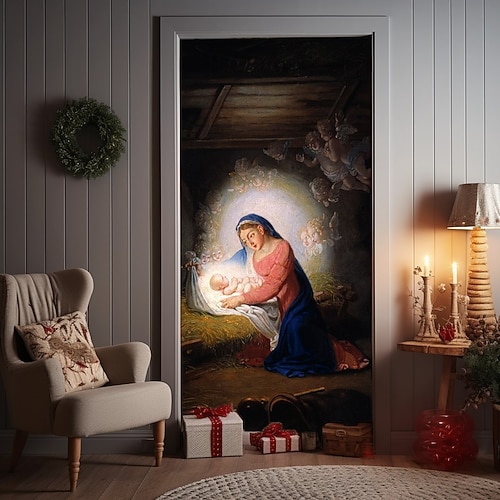 Copriporta natalizio, decorazioni invernali per le feste, tende con stampa della scena della natività di Gesù per ingresso, soggiorno, camera da letto, interni ed esterni, decorazioni religiose per la