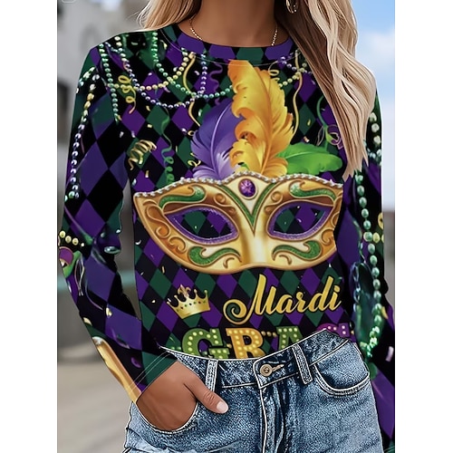 Karneval Damen T-Shirt Grafik Vintage Mode Stylisch Lange Ärmel Rundhalsausschnitt Regelmäßige Oberteile Täglicher Druck Lila Frühling Herbst