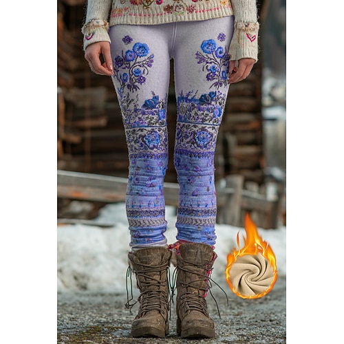 Leggings Boho Viking da donna foderati in pile vacanza stile etnico vintage a vita alta a lunghezza intera Stampa 3D floreale termica calda antivento comodi elastici formali vacanza casa gialla rosa