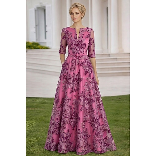 Linea ad A Lunghezza al pavimento Vestito maxi Abito da invitata a nozze Abito da cerimonia per signora Manica 3/4 Scollo a V Elegante Vintage Formale Raso Pizzo Organza con Stampa floreale Ricamo