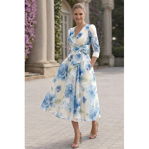 Linea ad A Abito Lunghezza alla caviglia Abito da Cocktail Abito da cerimonia per signora Manica 3/4 Scollo a V Elegante Casual Formale Ospite di nozze Ferie Chiffon con Stampa floreale Volant Balze