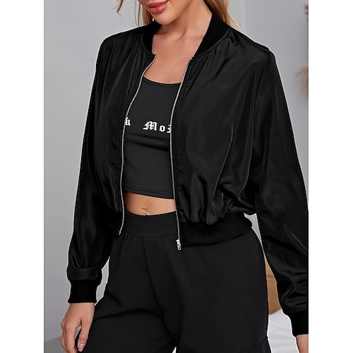 Damen Bomberjacke Bequem Atmungsaktiv Reißverschluss Lässig Einfach Urlaub Straße Lässig Alltagskleidung Reisverschluss Kurz Stehkragen Normale Passform Langarm Oberbekleidung Schwarz Rote Armeegrün