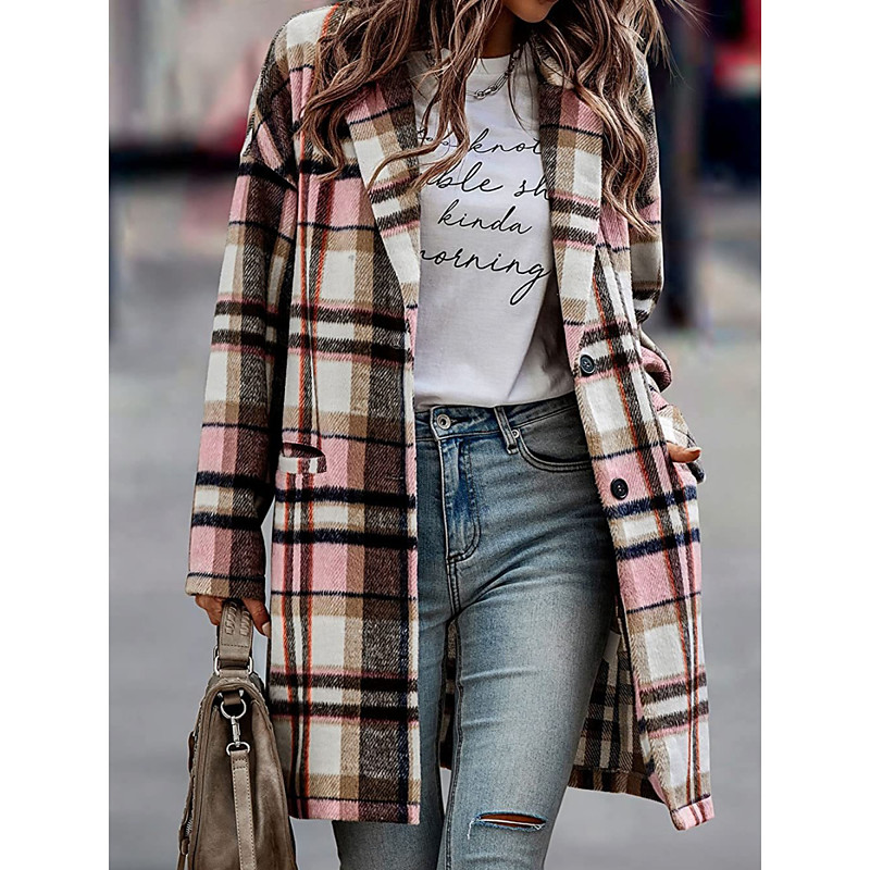 Women's Casual Jacket Comfortable Breathable Pocket Buttons Print Casual Plaid Vacation Street Casual Daily Wear Single Breasted Long Turndown Regular Fit Long Sleeve Outerwear Black Pink Red Spring