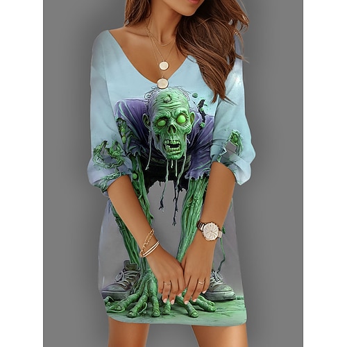 Abito mini stampa teschi da donna abito a spostamento vacanza casual quotidiano festa di cocktail vestibilità morbida grafica teschio maniche lunghe colletto a V giallo blu viola verde estate