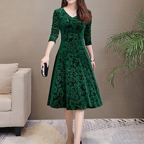 Per donna Abito Midi Abito in Velluto Vestito da Festa Vestito a ruota Abito verde smeraldo Elegante Moda Romantico Vacanza Abito Invernale Ospite di nozze Taglia piccola Floreale Manica Lunga Scollo