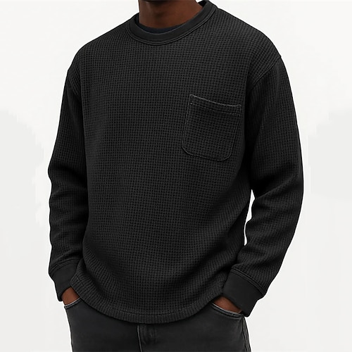 Herren T Shirt T-Shirt Waffelstrick T-Shirt Langarmshirt Langarm Rundhalsausschnitt Frühling Herbst Einfach Mode Designer Basic Taschen Urlaub Straße Ausgehen Dunkelbraun Schwarz Weiß Top T-Shirt für