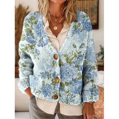 Per donna Felpa Cardigan Moda Quotidiano Casual Floreale Grafico A Coste Scollo a V Floreale Bottoni Spalla scesa Manica Lunga Top Regolari Maglia Quotidiano Weekend Blu Primavera Autunno