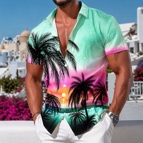 Per uomo Camicia camicia di lino Camicia da spiaggia Camicia hawaiana Albero di cocco Esterno Strada Nero Rosa Verde Grigio Maniche corte Collo ripiegabile Estate Primavera Abbigliamento Stampa