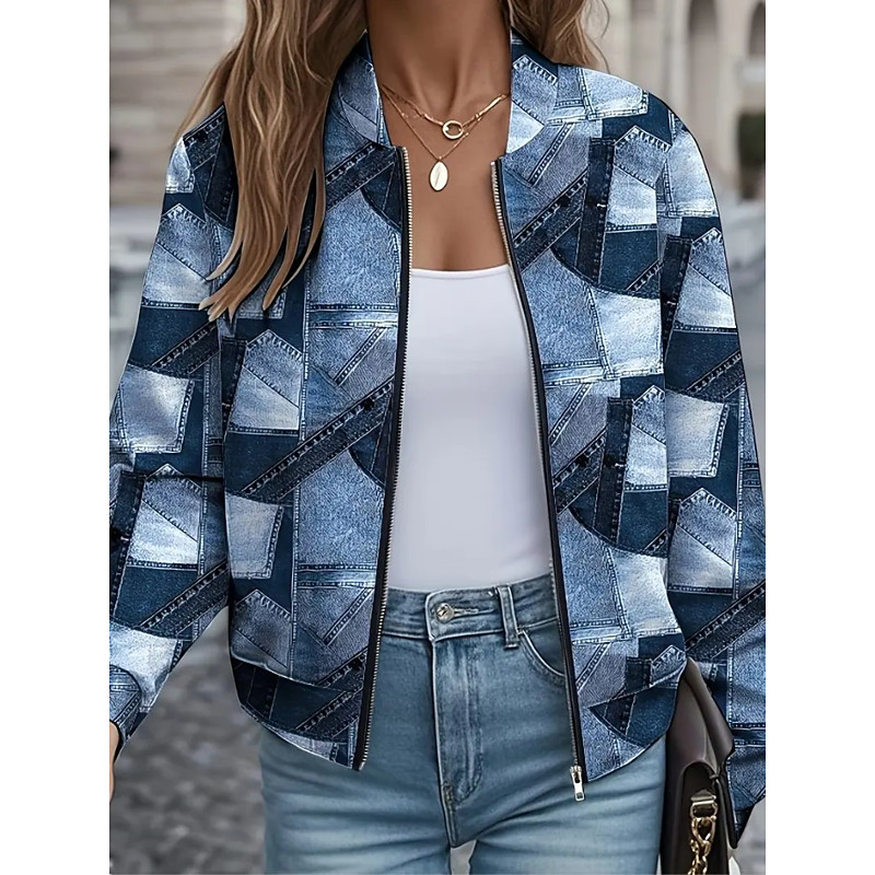 Women's Casual Jacket Warm Quick Dry Zipper Pocket Elegant Fashion Daily Simple Camouflage Vacation Casual Daily Holiday Short Baseball Collar Regular Fit Long Sleeve Outerwear Navy Blue Blue Fuchsia