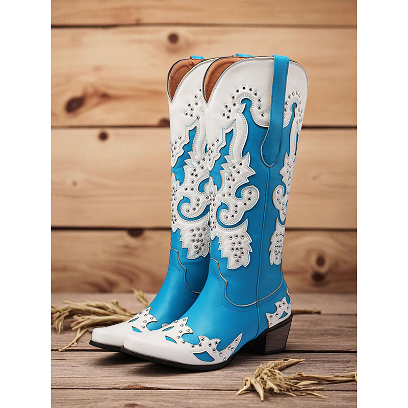 Women's Red and White Western Cowboy Boots with Rivet for Christmas, Comfortable Heel Boots for Holiday Celebrations and Winter Festivities