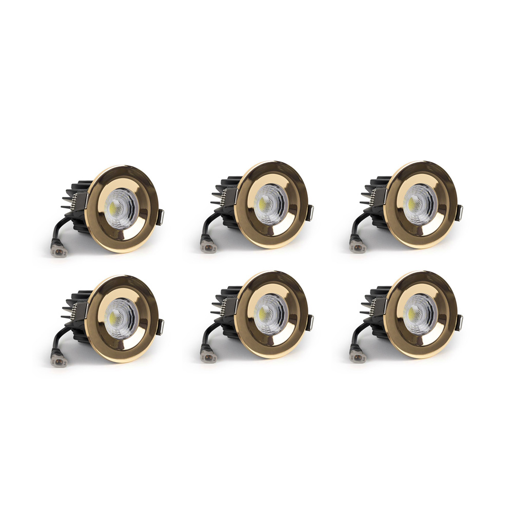 6 Pack - Soho Lighting Polished Brass LED Downlights - Fire Rated - Fixed - IP65 - CCT Switch - High CRI - Dimmable