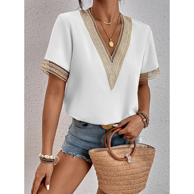 Women's Elegant Lace Tops Eyelet Blouse Lace Work Stylish Modern Short Sleeve Romantic Petite Tops Summer Holiday Wear Black Summer Spring Semi Formal Blouses