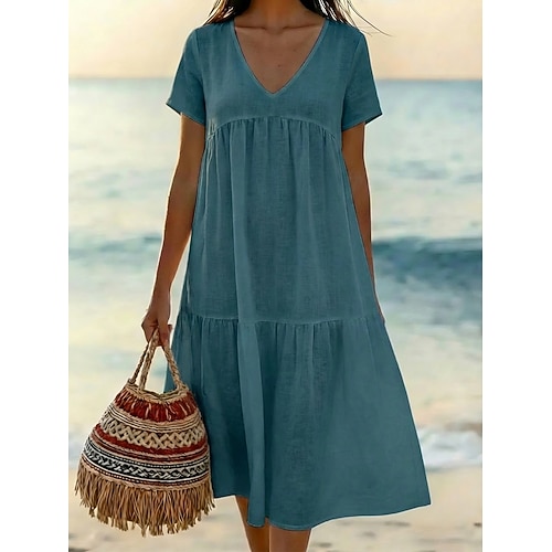 Per donna Abito Midi Abito a Tubino Abito Bianco Abiti in cotone e lino Abito in lino Casual Quotidiano Vacanza Vestibilità comoda Semplice Manica Corta Scollo a V Blu Nero Bianco Rosa Estate