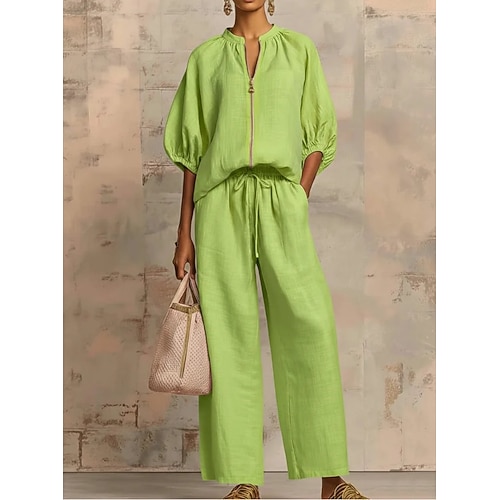 Per donna Set di Pantaloni Finto cotone e lino Senza Maniche All'americana Tinta unica Moda Streetwear Casuale Quotidiano All'aperto Blu Verde Cachi Estate Vestibilità comoda