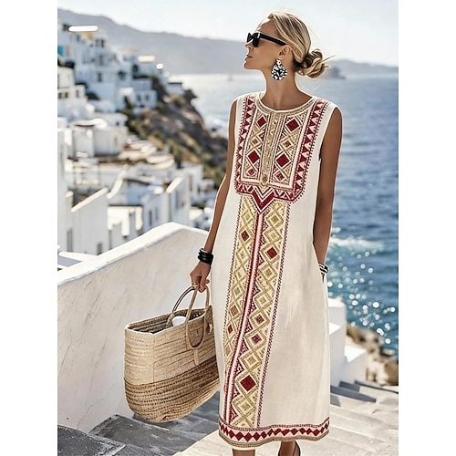 Per donna Abito Midi Abito a Tubino Vestito Estivo Abito a trapezio Vacanza Casual Boho Spiaggia Uscire Vestibilità comoda Grafico Geometrico Senza Maniche Girocollo Bianco Estate Primavera