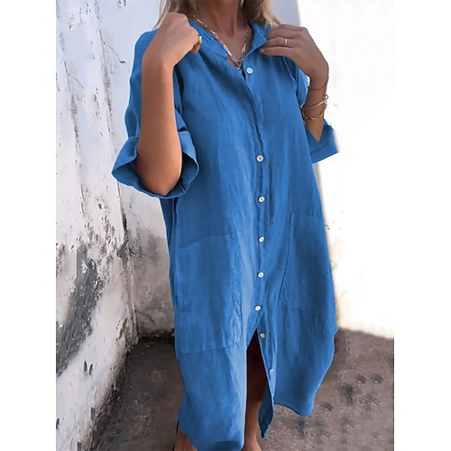 Per donna Abito Midi Abiti in cotone e lino Abito Camicia Vestito Casual Elegante Moda Moderno Quotidiano All'aperto Vacanza Vestibilità comoda Semplice Mezza Manica Colletto a Camicia Blu Nero Rosso
