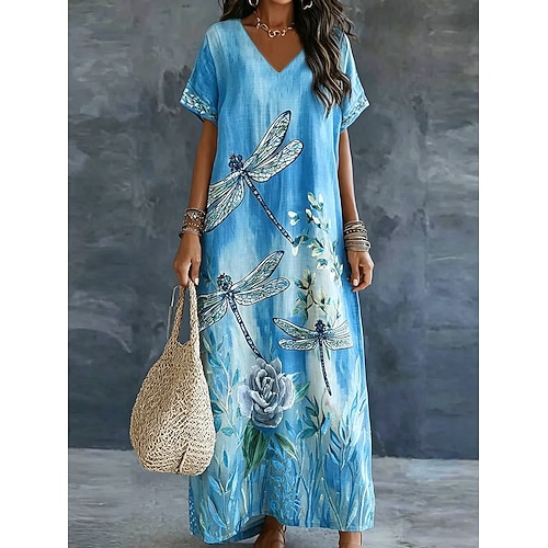 Per donna Abito maxi Vestito Casual Elegante Bohemien Vintage Vestibilità comoda Floreale Grafico Manica Corta Scollo a V Blu Rosa Viola Arancione Estate Primavera
