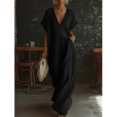 Per donna Abito maxi Finto cotone e lino Abito a trapezio Casual Quotidiano Vestibilità comoda Semplice Manica Corta Scollo a V Blu Nero Bianco Giallo Estate Primavera