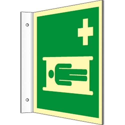 Fahnenschild Krankentrage, ISO 7010, Kunststoff, nachleucht.,160-mcd, 200x200 mm