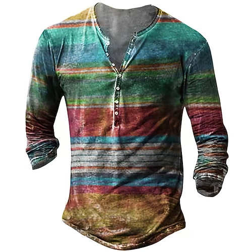 Herren T Shirt Henley Hemd T-Shirt Langarmshirt Langarm Henley Frühling Herbst Gestreift Mode Designer Basic Knöpfe Urlaub Straße Ausgehen Regenbogen Top T-Shirt für Herren