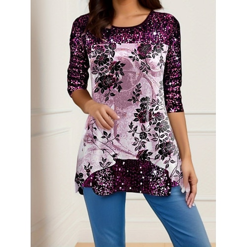 Per donna maglietta Liscio Di tendenza Moderno Informale Manica lunga Girocollo Top regolari Giornaliero Fine settimana Collage Tagliato Nero Vino Grigio Autunno