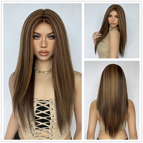 Parrucca in pizzo sintetico Liscio Stile 24 pollice Marrone con riflessi dorati Parte di mezzo Parte anteriore in pizzo 13x5x1 Parrucca Per donna Parrucca Castano dorato con biondo
