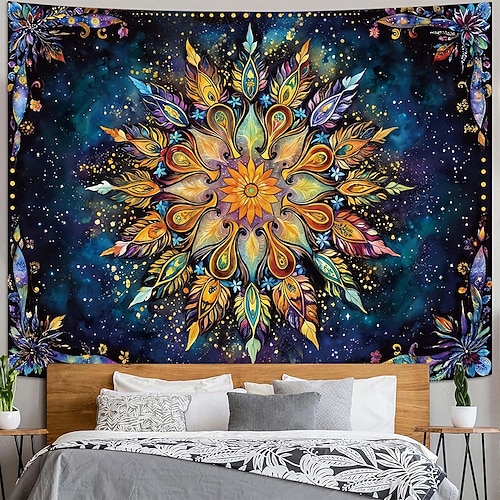 Arazzo da parete con mandala galassia bohémien, cielo stellato notturno, medaglione con piume di pavone, arazzo da parete, arte psichedelica e celeste, arredamento per la casa, camera da letto,