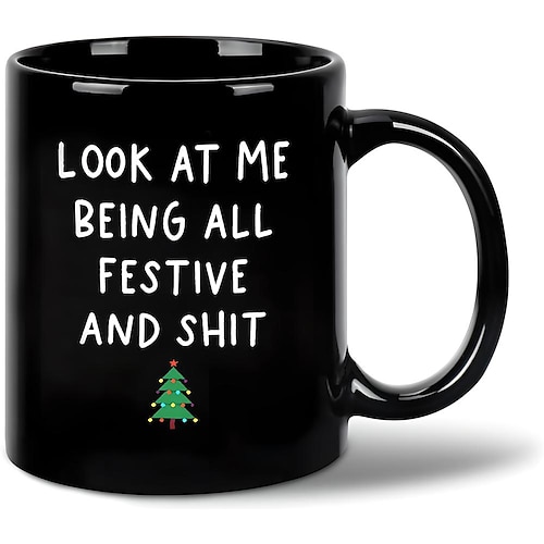 Weihnachtsgeschenk-Tasse, schwarze Grafik, lustige Kaffeetasse, 330 ml, „Look at me being all festive and shit", Keramiktasse, Retro-Vintage-Design