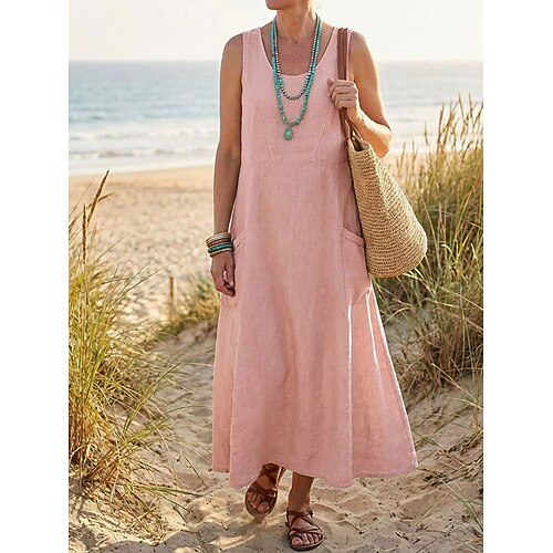 Per donna Abito Midi Abiti in cotone e lino Abito a Tubino Vestito Estivo Vestito Canotta Elegante Moda Moderno Quotidiano All'aperto Vacanza Vestibilità comoda Semplice Senza Maniche Collo a U
