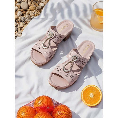 Sandali da donna con tacco grosso - design con strass traforati, fibbia decorativa retrò, suola comoda, per passeggiate all'aperto, giardino e outfit estivi casual