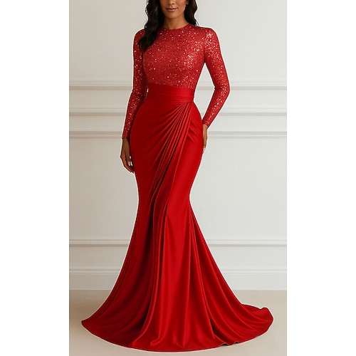 Sirena Tromba Lunghezza al pavimento Abito da Sera Elegante Setoso Manica Lunga Girocollo Matrimonio Formale Abito Champagne per la Madre della Sposa Raso Elasticizzato con Glitter Pieghe