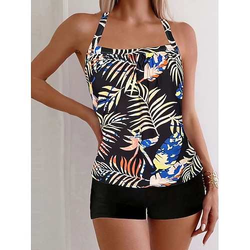 Costume da bagno tankini da donna 2 pezzi pantaloni corti palma controllo pancia vita alta slinguato senza schiena vacanza in spiaggia scollatura a giro floreale senza maniche